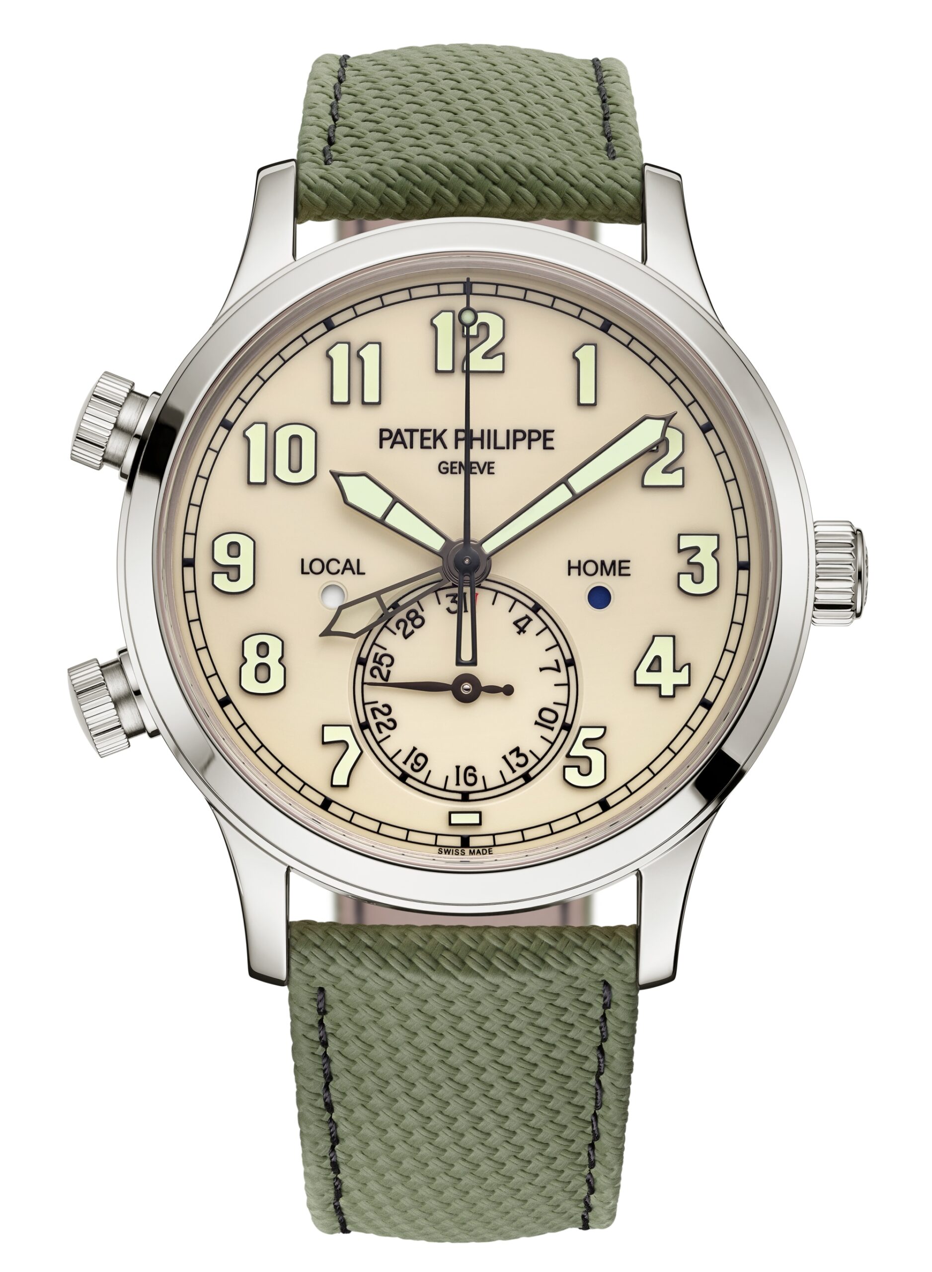 Calatrava Pilot Travel Time bằng vàng trắng, với mặt số sơn mài màu ngà và chức năng thời gian du lịch. Bộ máy tự động Caliber 26-330 S C FUS mang đến sự tiện lợi cho những người yêu thích khám phá.