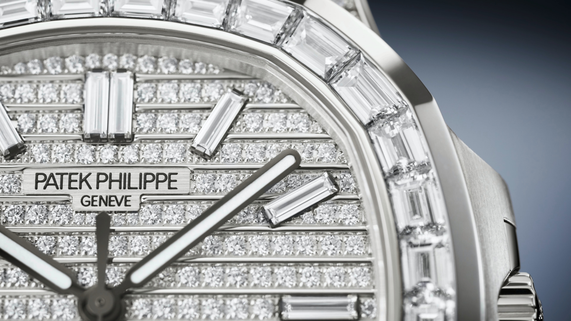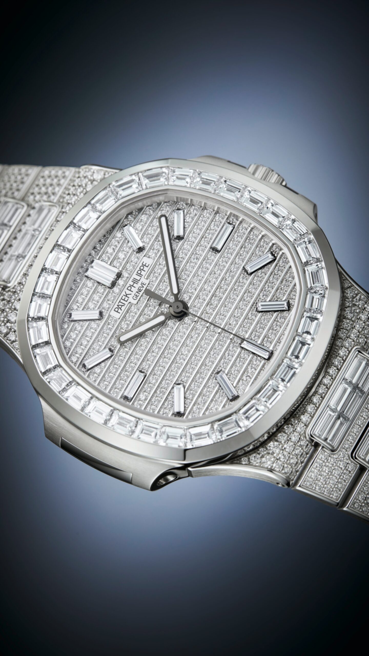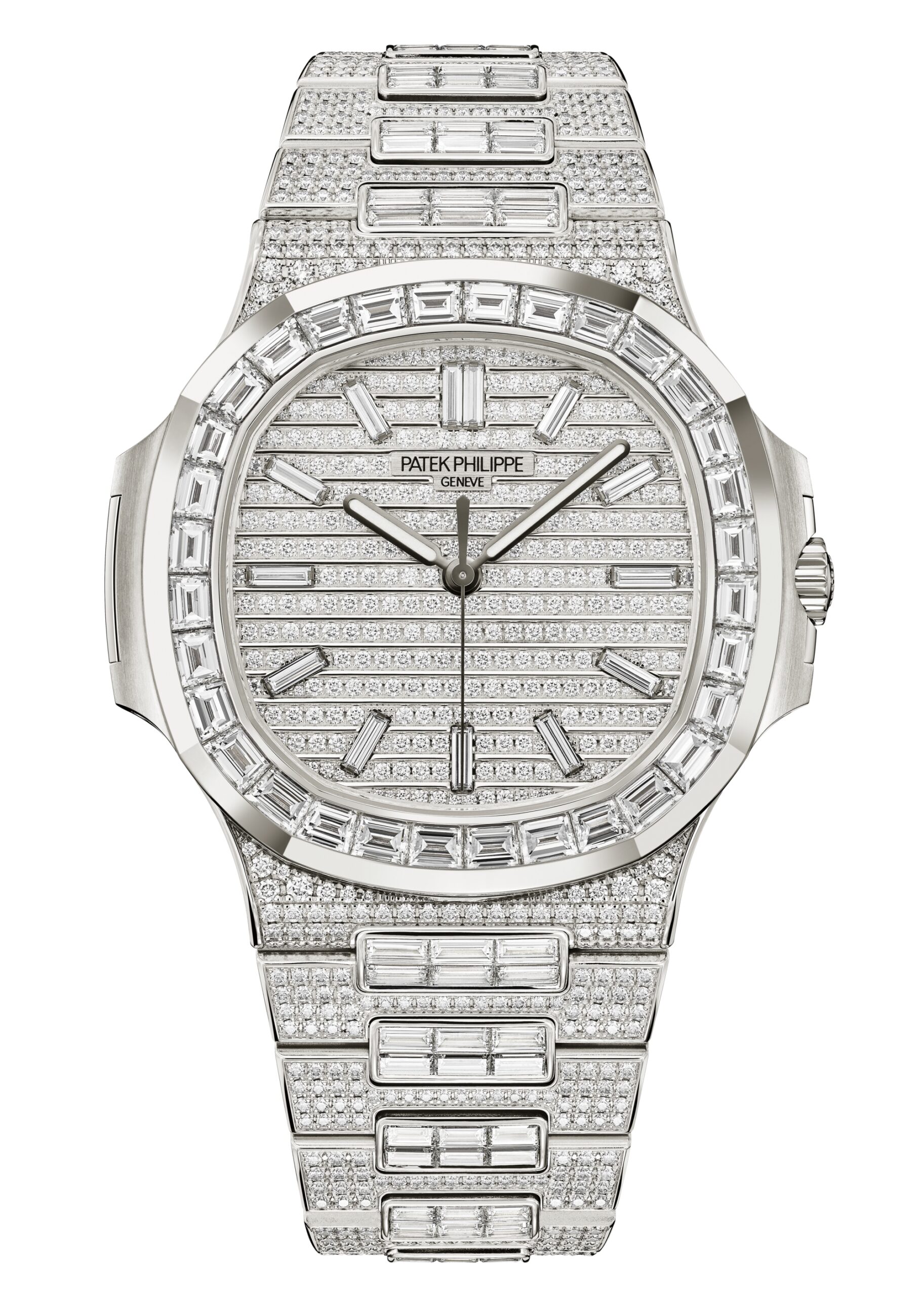 Nautilus Haute Joaillerie bằng vàng trắng, với bezel đính kim cương cắt baguette và mặt số, dây đeo đính kim cương brilliant-cut. Đây là biểu tượng tối thượng của sự xa xỉ và tinh tế.