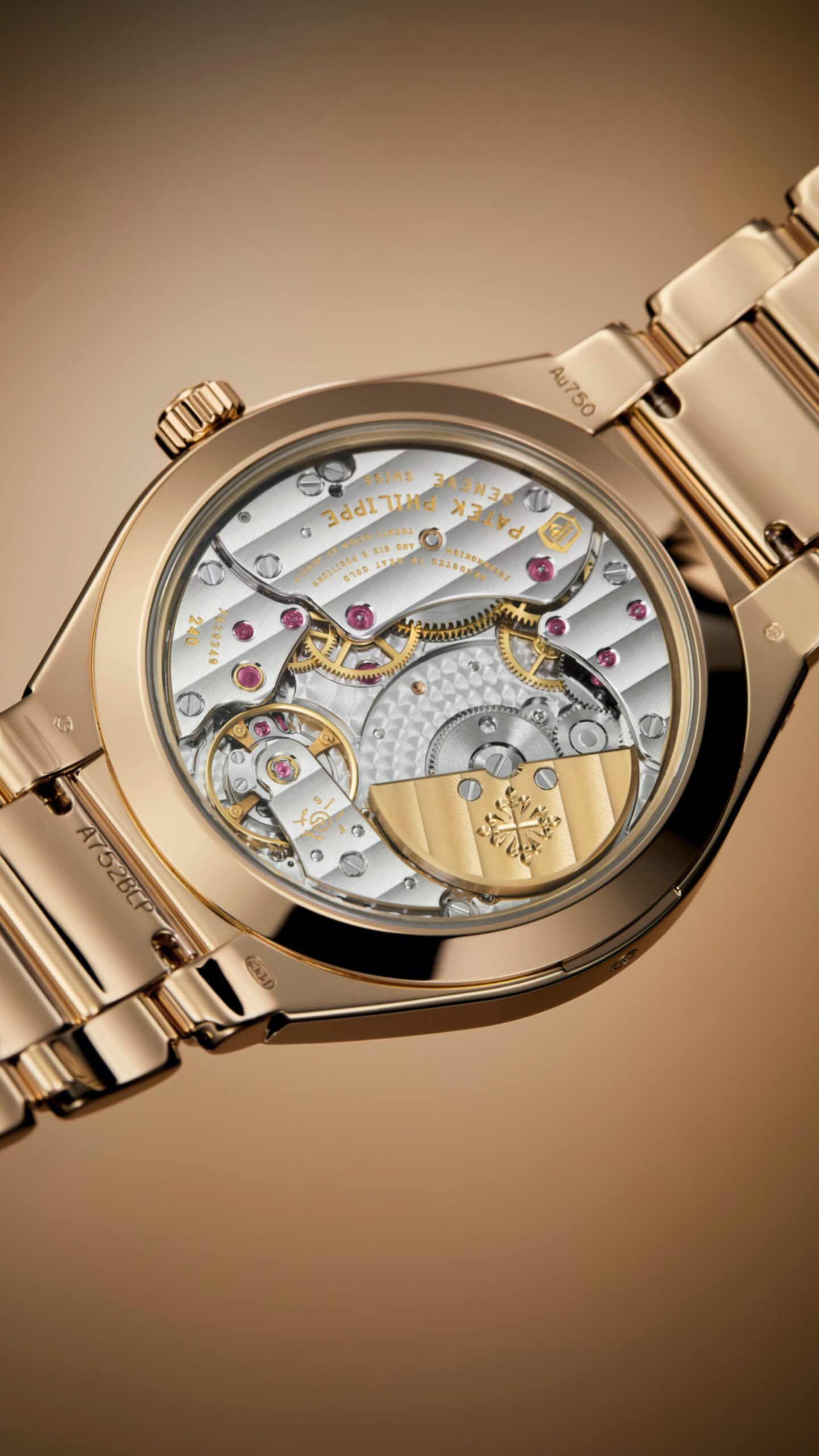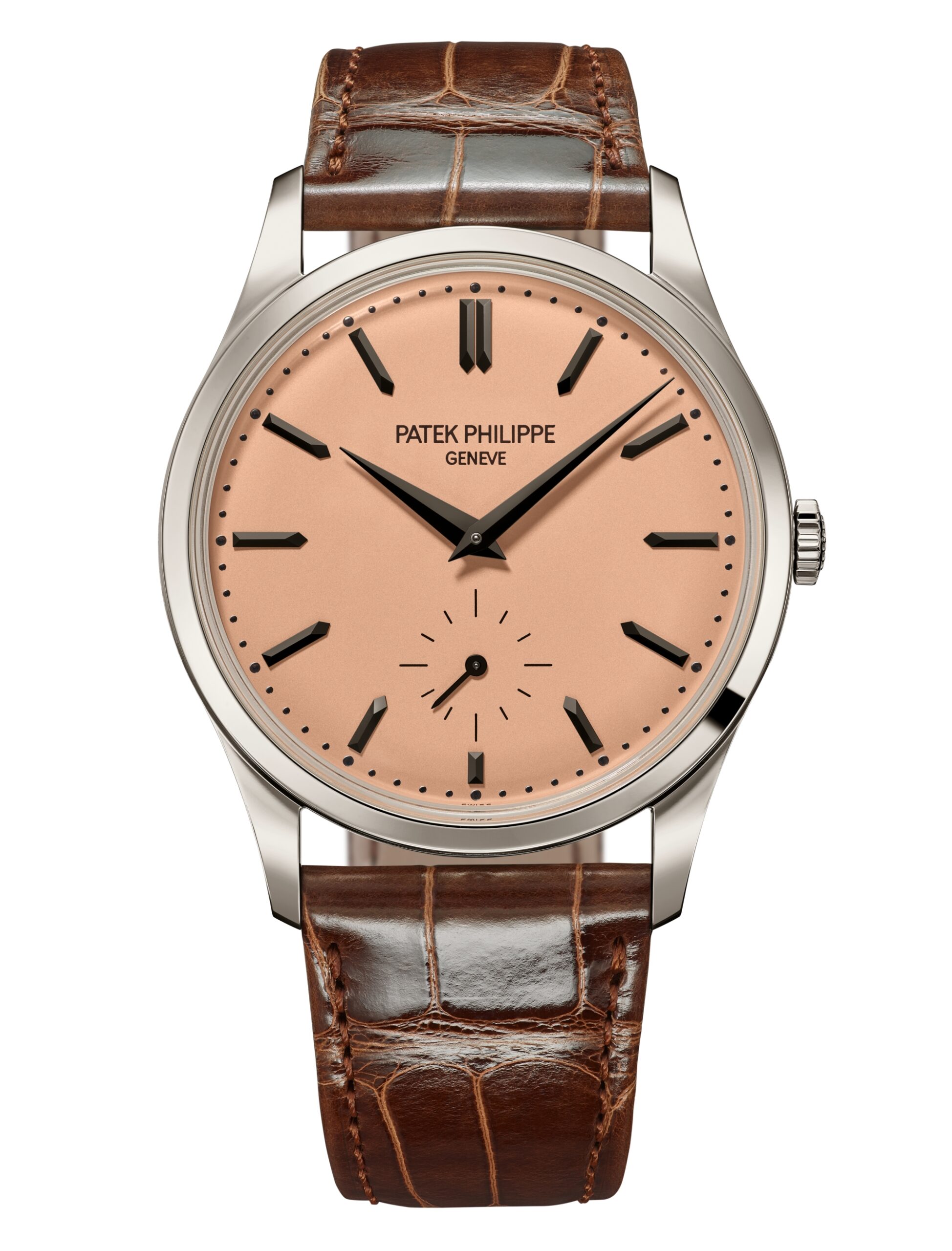 Mẫu Calatrava bằng bạch kim với mặt số opaline vàng hồng, mang phong cách thanh lịch cổ điển. Bộ máy thủ công Caliber 30-255 PS có dự trữ năng lượng 65 giờ và chức năng stop-seconds để điều chỉnh thời gian chính xác.